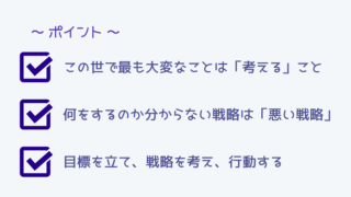 組織・ビジネス ~悪い戦略とは何か?~ ゆー少し前に「目標」の立て方について話をしてもらったと思うんですけど、色々考えていると「目標」以上に「戦略」の方が大変な気がしているんですよね…。目標達成するために考えるべき「手段」や「道のり」だけではなくて、自分の「感情のコントロール」ま... 2026.02.21 組織・ビジネス