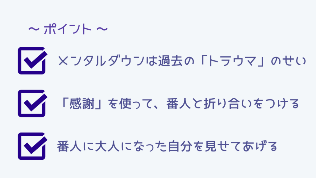 メンタルダウンの仕組みとしては、トラウマに対する番人の過剰な保護が要因やと思うねん。