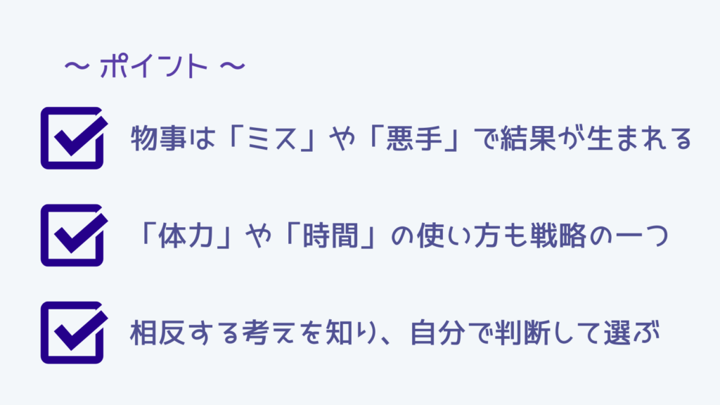 物事の結末は「ミス」とか「悪手」によることが、事実として多いんよ。