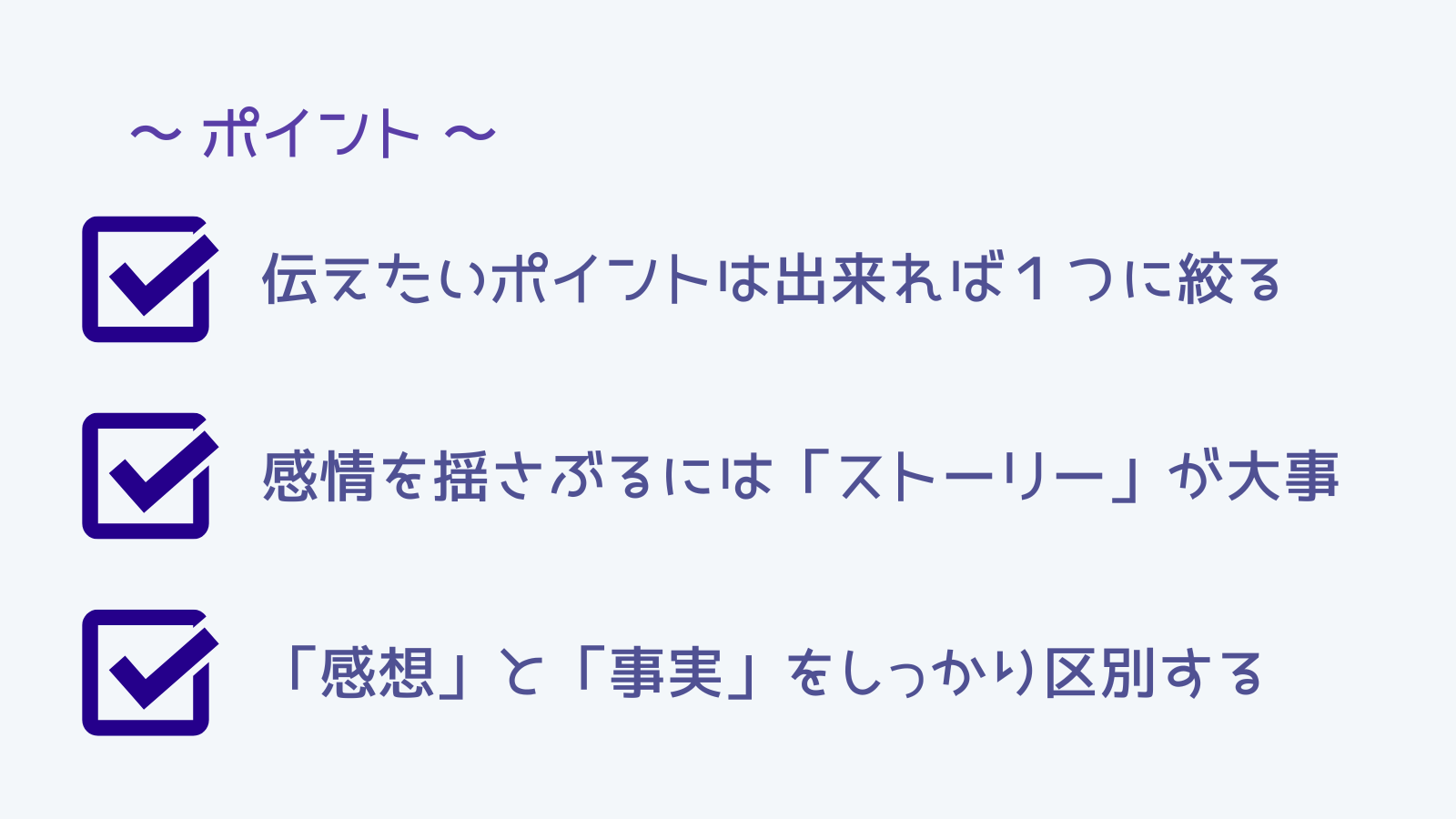 ストーリーは基本的に「共感」に対して感情的に訴える時に有効やから、状況に応じて必要な構成を考えたらえぇ。