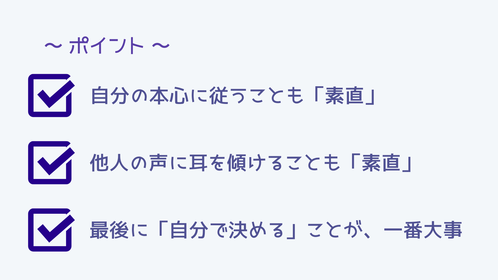 君の解釈では「周りの話を受け入れる」と言うのは、少し違うというイメージやったな?