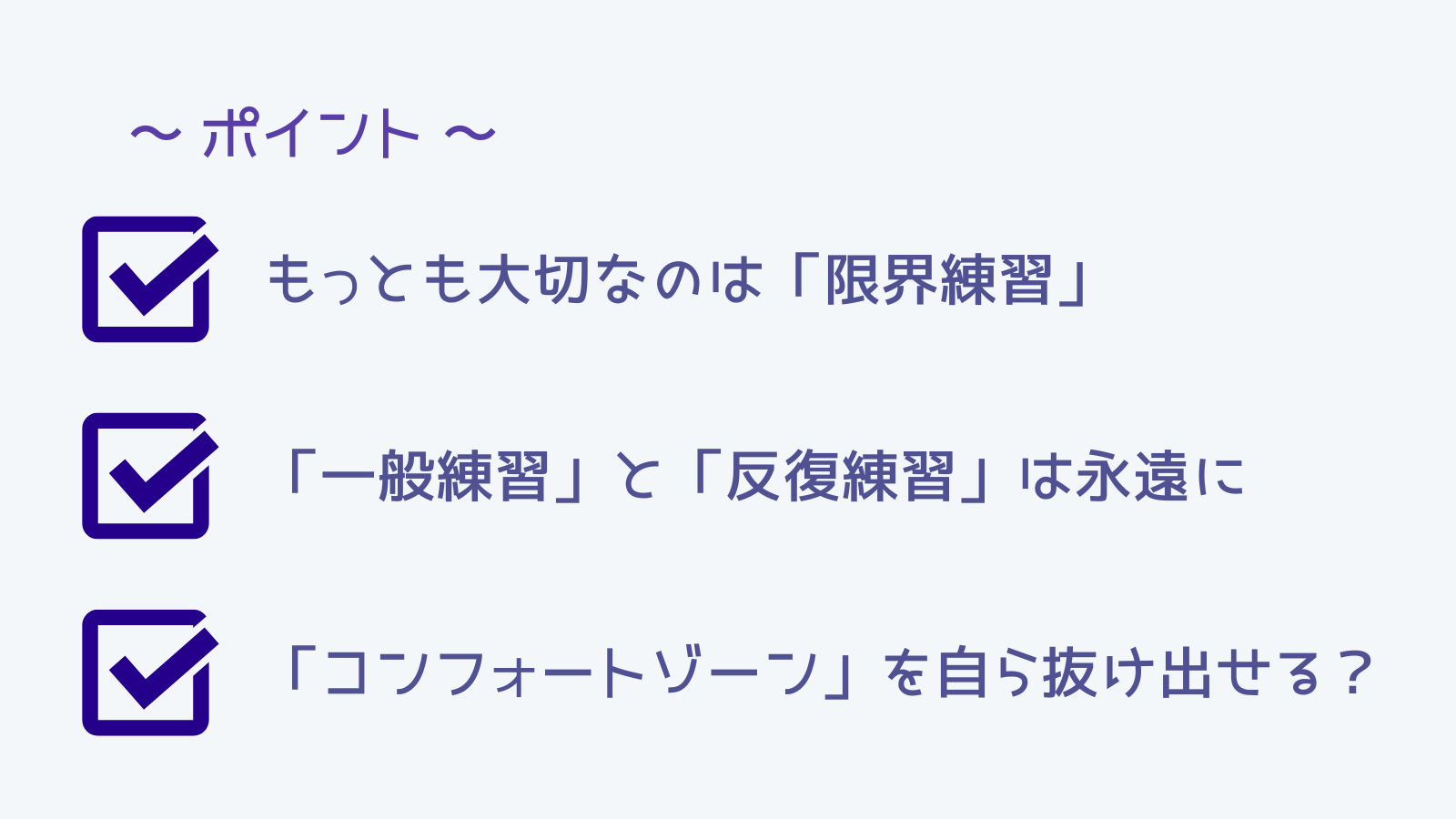 自分のギリギリまで追い込むことと、現状を少しだけ超える目標設定こそが「限界的練習」の本質になるわ。